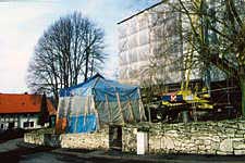 Auch den Turmhelm vor der Kirche überdecken nun Plastikplanen,