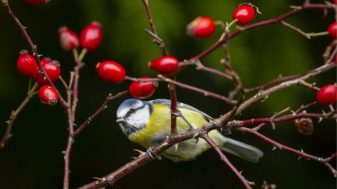 Blaumeise u. Hagebutten
