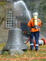 Durch den Brand am 07. Nov. 1999 erlitten die vier Glocken, die im Kirchturm hingen, keine Beschädigungen. Sie wurden am 02. Dez. 1999, nachdem der Helm des Turmes abgehoben war, aus der Glockenstube gehievt und für die Bauzeit auf dem Kirchhof deponiert. Seither ist die Kirche stumm. Nur der Wind, der durch das Gestänge des Aussengerüstes und der Überdachung bläst, erzeugt einen merkwürdigen Klang.