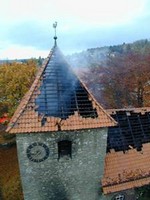 - Eine Spendenaktion in der Vorweihnachtszeit, die mit dem Motto "Im Advent wieder Tagesgeläut" warb, erbrachte stattliche DM 2.500.- für die Läuteeinrichtung unter den 120 Haushalten des Dorfes. Im Juli 1962 schliesslich installierte die Fa. Perrot aus Calw/Schwarzwald die Turmuhr mit drei Zifferblättern auf N-, W- und S-Seite des Turmes. Eine Zeitschaltautomatik regelte das tägliche Läuten, eine Automatik das Betglockenschlagwerk. Diese Anlage zerstörte der Brand am 7. November 1999.