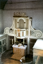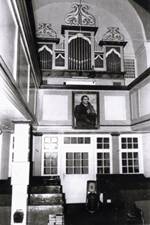 Klappbare Fenster trennten vom Kirchenraum die ebenerdige Turmvorhalle ab, von der aus die beiden Treppen zur Orgelempore, den beiden Seitenemporen und dem Turm führten.