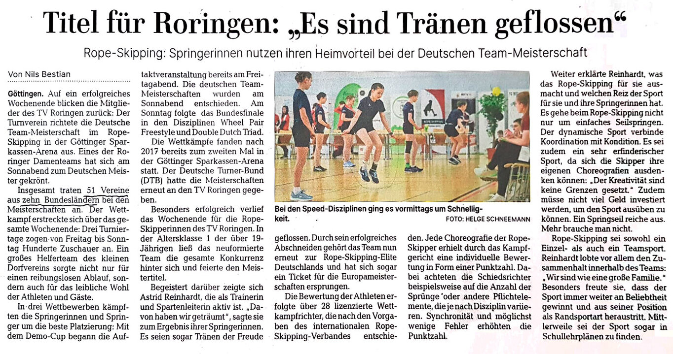 Die Rope Skipperinnen des TV Roringen hatten den perfekten Einstand bei der Weltmeisterschaft in Colorado Springs in den USA. In der Disziplin „Single Rope Speed Relay“ schob sich das Quartett mit Enja Kubitschke, Aenne Bannasch, Annika Reinhardt und Viviane Simon zwischen zwei Teams aus Hongkong.
